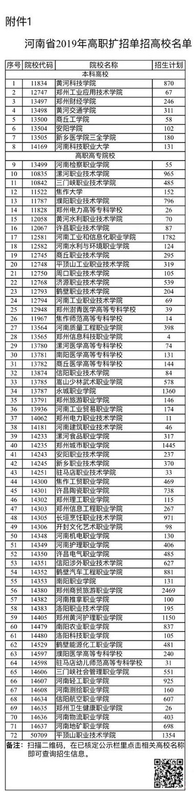 河南省教育厅发布《关于公布河南省2019年高等职业院校扩招单独考试招生高校名单的通知》(以下简称《通知》),我省2019年高等职业院校扩招单独考试招生高校名单公布,黄河科技学院等72所高校入选。