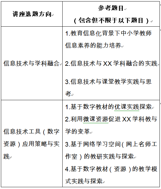 讲座人申报的选题方向须根据选题范围选定(见下表),具体讲座题目可根据参考题目选定,也可自定与“一师一课”有关的其它选题。