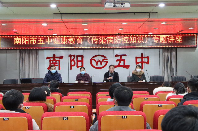 为使师生了解冬季传染病的种类、症状以及预防措施,增强卫生防疫意识,全面提升师生健康素养,推进校园疾病预防工作科学化、制度化、规范化,1月8日晚,南阳市五中邀请专家为我校部分师生做了预防秋冬季节传染病知识讲座。莅临讲座的有南阳市第六人民医院院长翟淑丽同志,南阳市健康教育所所长、南阳市五中健康副校长马国民同志,南阳市第六人民医院呼吸科张信鸽主任。活动由我校专职副书记高道军同志主持。