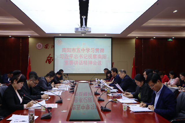 为了传达、学习、贯彻习近平总书记在推进南水北调后续工程高质量发展座谈会上的重要讲话和在南阳视察调研时的重要指示精神,以及省、市、局领导干部会议精神,动员全校上下深刻学习领会,全面对标践行,推动习近平总书记重要讲话和指示精神在我校落地生根,5月17日下午,南阳市五中在九楼会议室召开学习贯彻习近平总书记视察南阳重要讲话精神会议,学校全体领导参加了会议。