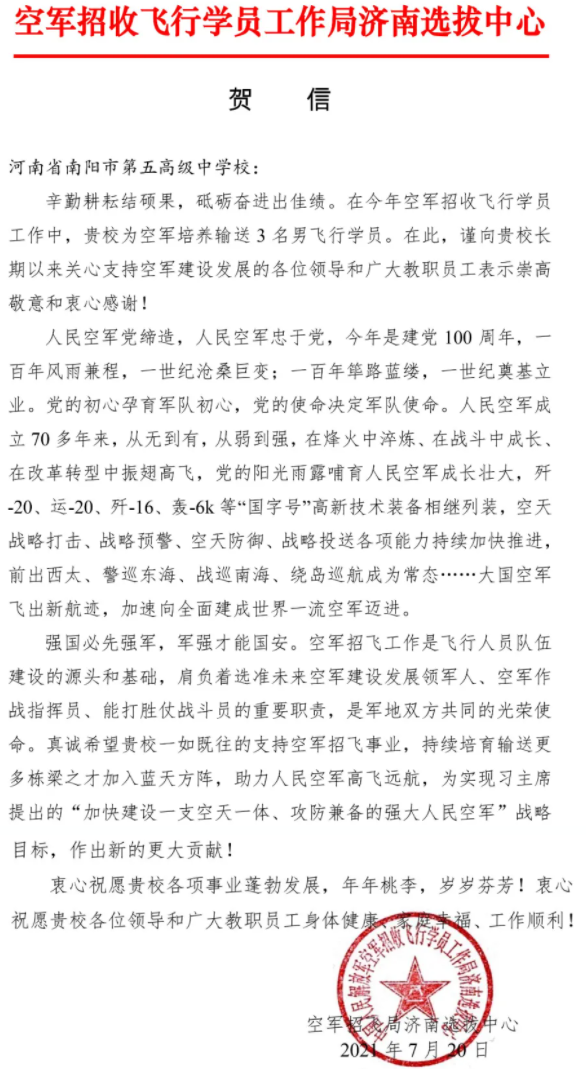 贺信!空军招飞局济南选拔中心给南阳市五中发来贺信