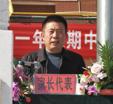 高一A部A01班学生家长陈良先生发言,陈先生首先向五中辛勤耕耘的老师们表示感谢,然后鼓励同学们不怕吃苦,努力奋斗,积极与老师、同学、家长交流,分享生活和学习的想法,争取成绩更上一层楼。